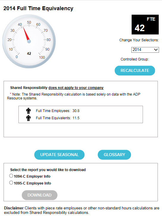 If the Affordable Care Act (ACA) applies to you as an Applicable Large Employer (ALE), these reports can now be found on the ACA “Shared Responsibility” calculator page in My ADP Resource to support your 1094 and 1095 filing.
