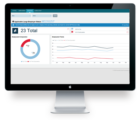 Review large employer status, month-to-month trends and download your ACA payroll reports from a new, modern dashboard that conveniently shows your ACA-related information in one place. The ACA reports for your 1094-C and 1095-C filings are available through a link from this new dashboard.